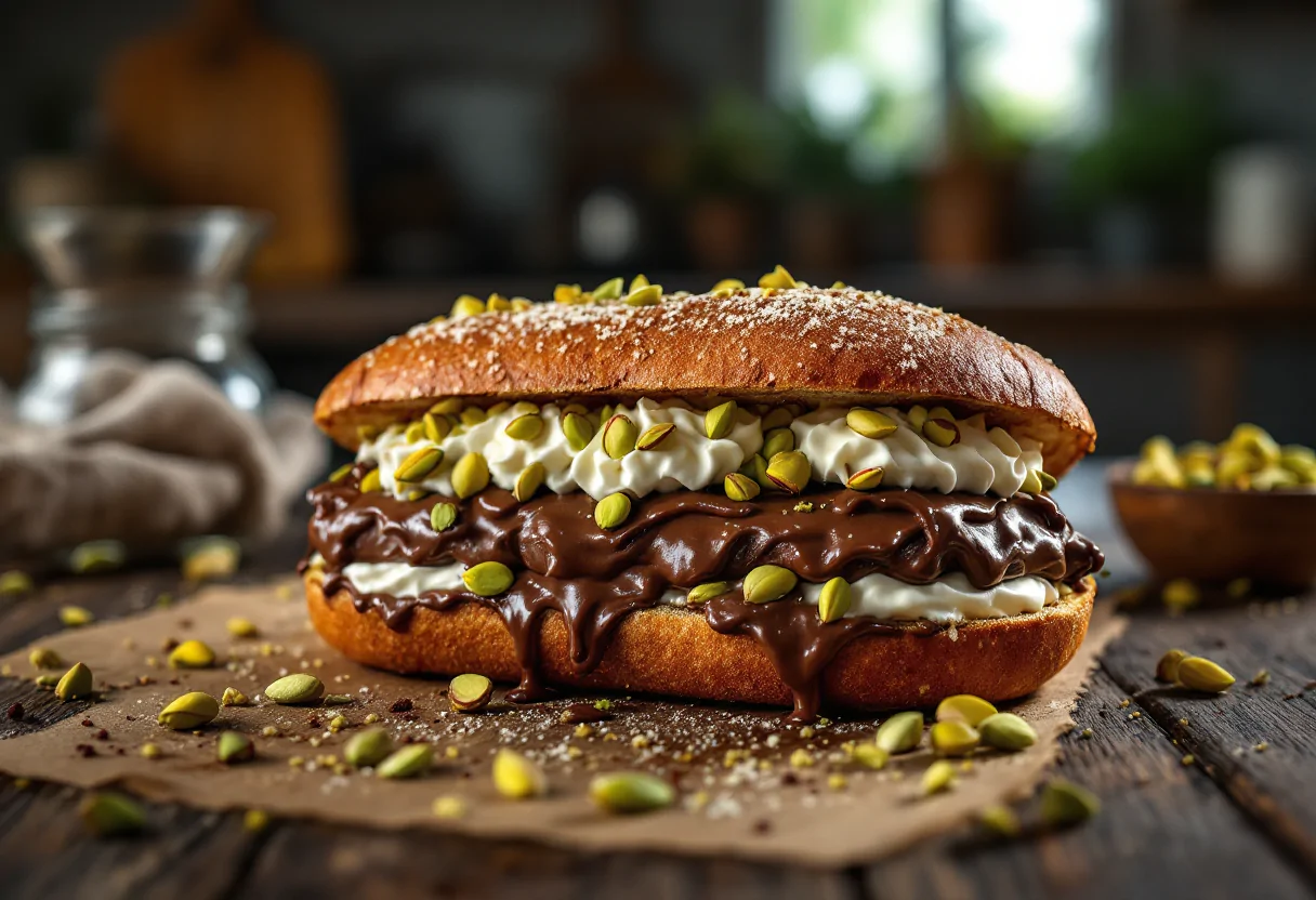 Per realizzare questo panino goloso, avrai bisogno di pochi ingredienti: pane fresco, nutella, panna montata e pistacchi tritati. L’abbinamento tra la nutella e la panna montata fresca crea una mousse soffice e avvolgente, mentre la granella di pistacchi aggiunge una nota croccante e un contrasto di sapori che rende ogni morso un’esperienza unica. Se desideri un tocco in più, puoi optare per una crema di nocciole artigianale e sostituire la panna montata con mascarpone, creando così una variante ancora più ricca e golosa.
