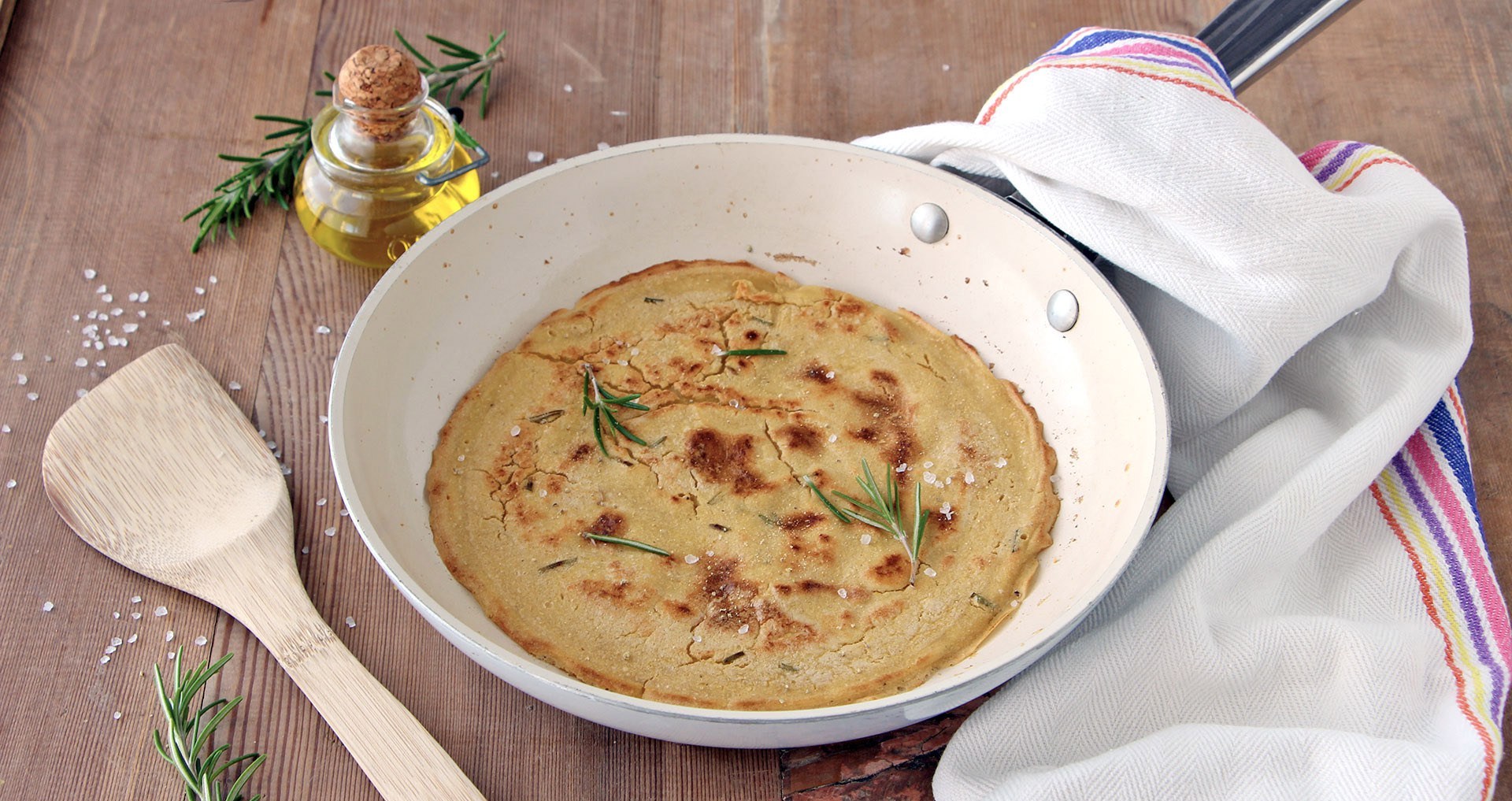 - Lasciare cuocere la farinata a fiamma media fino a quando anche la superficie inizia a rapprendersi e a gonfiarsi al centro, girare delicatamente la farinata con l’aiuto di una spatola e proseguire la cottura per altri 2 minuti.