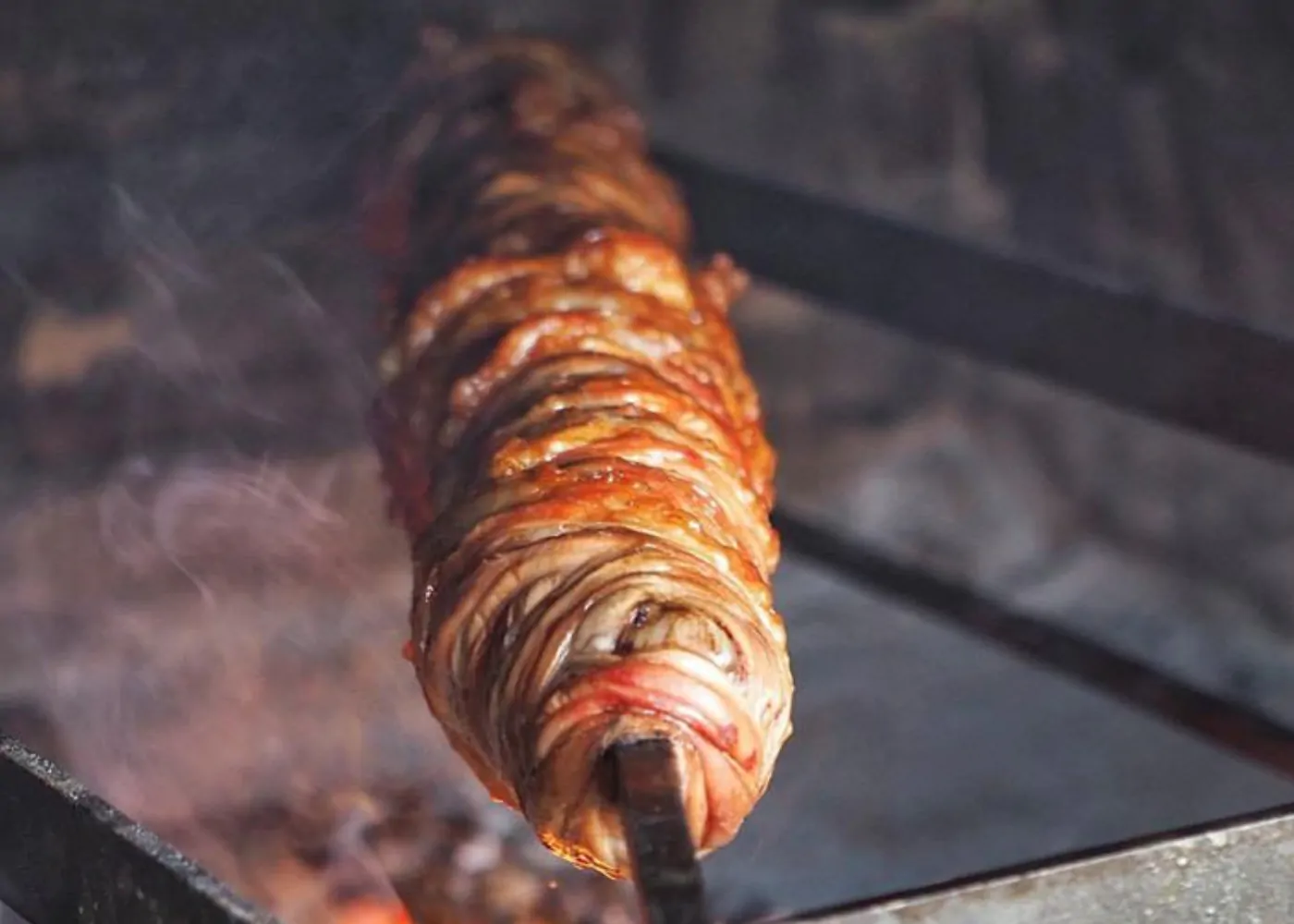 - Spennellate tutta la superficie del kokoretsi con olio extravergine d’oliva e cuocetelo alla brace per circa 2 ore, girandolo di tanto in tanto e posizionandolo lontano dal fuoco per consentire una cottura lenta e uniforme.