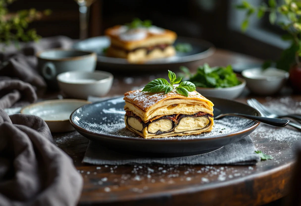 Cuoci in forno preriscaldato a 180°C per circa 25-30 minuti, fino a quando la superficie non sarà dorata e filante. Una volta sfornata, lascia riposare per qualche minuto prima di servire. Puoi accompagnare la millefoglie con un’insalata fresca o crostini di pane tostato per un pasto completo e gustoso.