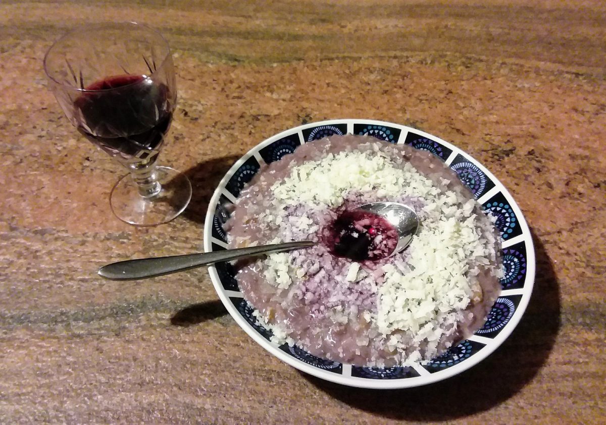 - Versare un bicchiere di vino rosso nel composto e fatelo sfumare per bene. Attenzione non coprite il risotto finché il vino no si è sfumato del tutto!