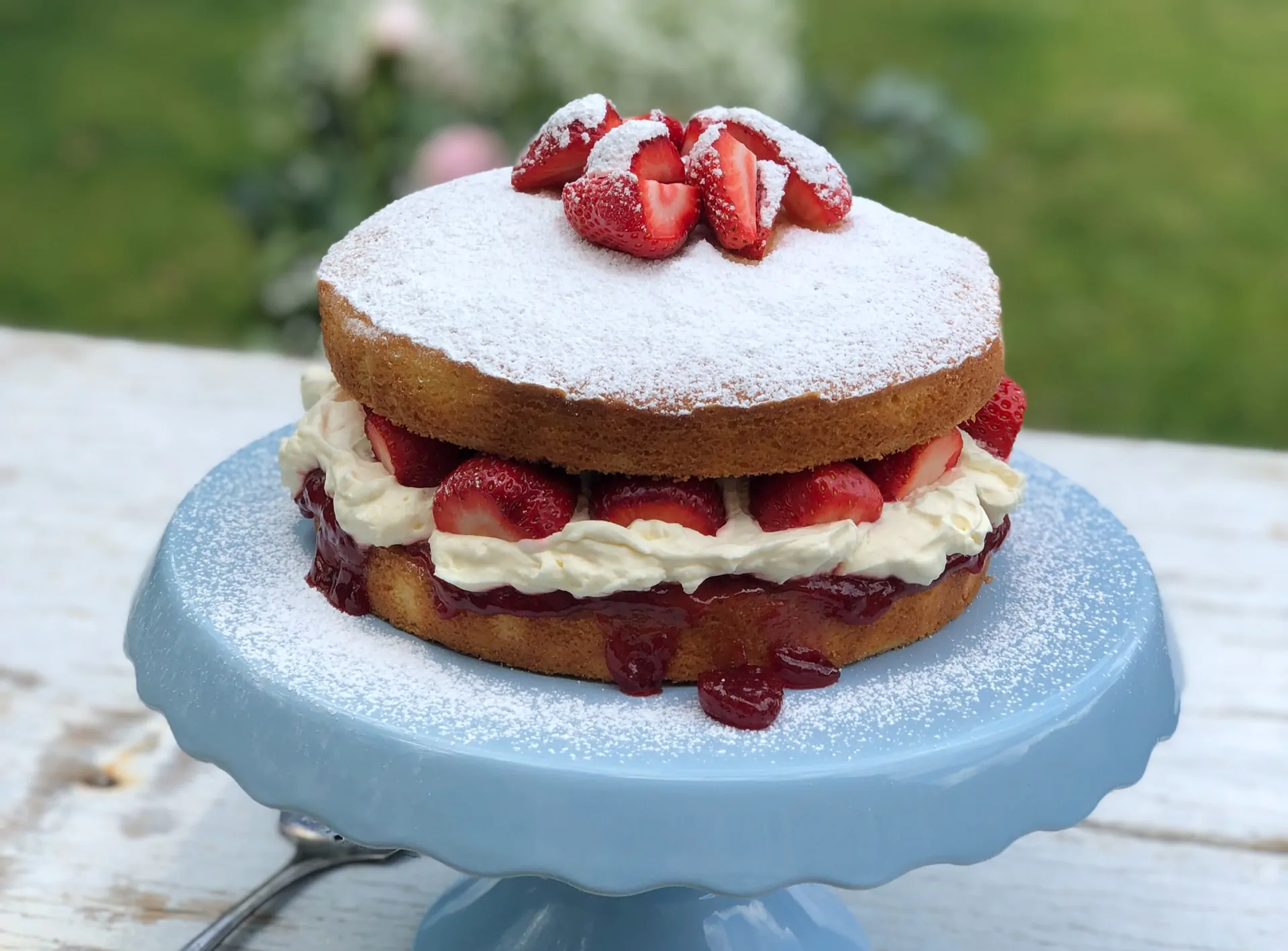 - Decorate la sponge cake in superficie con le fragole fresche tagliate a spicchi (vi consigliamo di spalmare prima un leggero strato di confettura per farle aderire) e zucchero a velo.