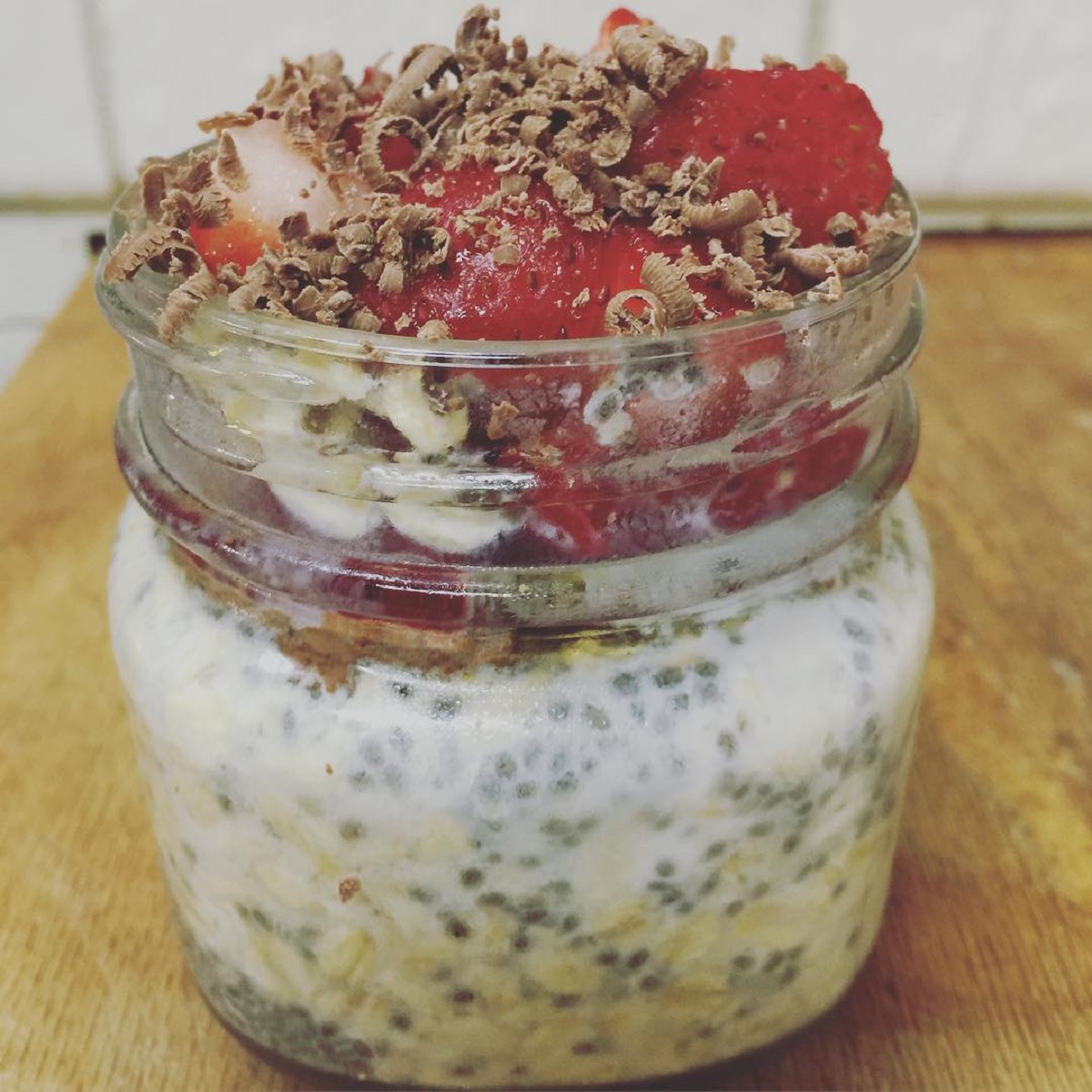 - In un barattolo, riempire con avena arrotolata, latte di mandorla, yogurt greco, cacao in polvere e sciroppo d’acero. Mescolare fino a quando non è ben combinato.